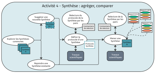 L’activité 4 - Synthèse est divisée en plusieurs tâches listées ci-dessous. Ces tâches s’appuient sur un modèle à remplir pour mener et produire la Synthèse et sur une trame de relecture pour guider des suggestions d'amélioration par les pairs.