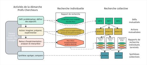 Les différentes activités de la démarche Profs-Chercheurs sont menées lors d'ateliers collaboratifs, encadrés par des animateur·rices de Communautés formés par l'équipe Profs-Chercheurs. Ces travaux de recherche sont menés et publiés sur une plateforme collaborative dédiée.